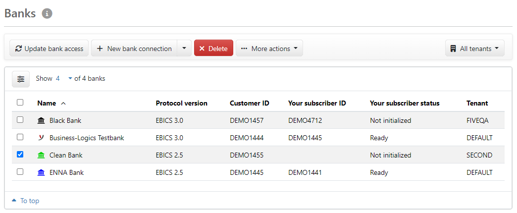 - Tenant: Name of the tenant to which the bank is assigned. The column is displayed if you have banks with several tenants.