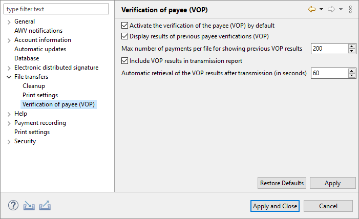 Figure: Preferences – File transfers – Verification of payee (VOP)